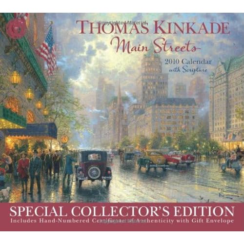 Thomas Kinkade, known as the Painter of Light, is the most collected artist in the world. His heartwarming paintings included in the Thomas Kinkade "Main Streets" Special Collectors Edition With Scripture 2010 Wall Calendar are inspired from simple life-affirming values: home, family, friends, tradition, community, and God.Thomas Kinkade artfully depicts the "Main Streets" of twelve of his favorite cities in this full-color monthly calendar. Each image is accompanied by a personal story about the inspiration behind the painting as well as a Bible verse. An individually numbered collector's keepsake card is tucked inside a vellum envelope, and the calendar is packaged in a beautifully printed folio sleeve.