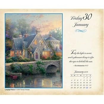 Thomas Kinkade is the most collected artist in the world. Known as the Painter of Light, he creates glorious paintings from simple inspirations: family, tradition, community, and the beauty and goodness of God's creation. A devout Christian, Thom uses his gift as a vehicle to communicate and spread inherent life-affirming values. These heartwarming motivations are evident in this 2009 Thomas Kinkade calendar.* 2009 marks the twenty-fifth anniversary of Thom's first published limited edition artwork.This favorite calendar format from Thomas Kinkade will contain for the first time a different image of Thom's artwork on every page. Each will also include a Bible verse.